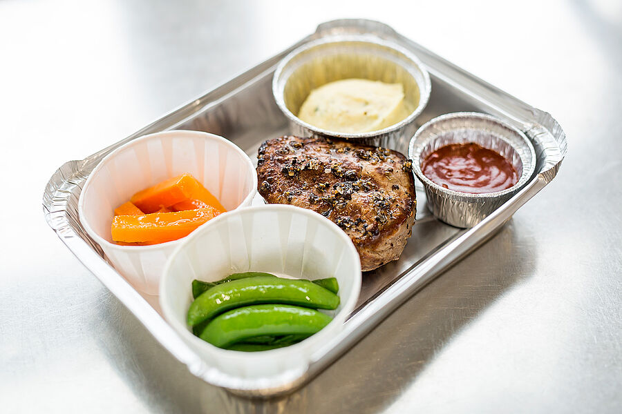 Die verschiedenen Essen werden per Hand von unseren Mitarbeitern in individuelle Menüschalen aus Aluminium, C-PET oder Tipper-Schalen abgefüllt. Die ausgesuchte Schale kann von der Airline an uns geliefert werden, oder wir bestellen die Schalen selbständig.
